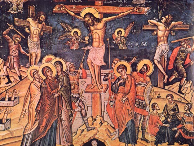 Η Σταύρωση του Θεανθρώπου Ιησού. (Τοιχογραφία από τη Μονή Σταυρονικήτα, ’γιο Όρος). Είναι η μεγαλύτερη τραγωδία, αλλά δεν έχει καταθλιπτική λύπη, επειδή πρόκειται να ακολουθήσει η Ανάσταση.Η Ορθοδοξία σέβεται και δείχνει τα ανθρώπινα συναισθήματα, αλλά δεν βασίζεται σ' αυτά. Κοιτώντας τον Εσταυρωμένο Ιησού δεν βλέπουμε ένα πτώμα, αλλά...