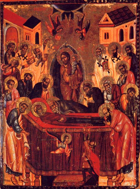 Η Θεοτόκος Μαρία αναπαύθηκε σε ηλικία 59 ετών. Ο Γιός της ήρθε ο Ίδιος να πάρει την ψυχή της και το σώμα της μεταφέρθηκε στον ουρανό τρεις μέρες μετά. Εδώ βλέπουμε το Θεάνθρωπο Ιησού να κρατά την ψυχή της μητέρας Του σαν μωρό. Γύρω από το κρεβάτι της στέκονται οι Απόστολοι. (Μονή αγίας Αικατερίνης, όρος Σινά, 13ος αιώνας).