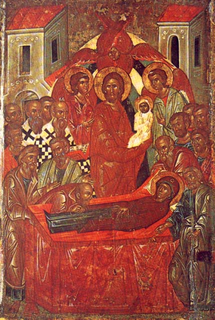 Κοίμηση της Θεοτόκου. Πίσω από τον Θεάνθρωπο Ιησού είναι ένα Σεραφείμ και άλλοι άγγελοι. (Μονή Τοπλού, Κρήτη, 15ος αι.)