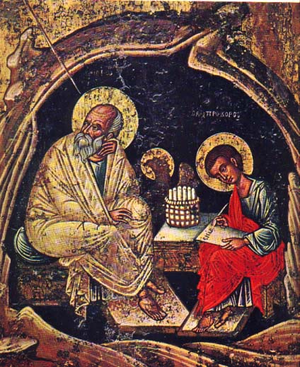 Ο άγιος Ιωάννης ο Θεολόγος υπαγορεύει το βιβλίο της Αποκάλυψης στο μαθητή του, Πρόχορο. (Φορητή εικόνα από τη Μικρά Ασία, 15ος αι.)