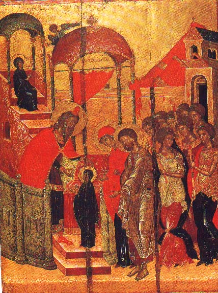 When Virgin Mary was three years old, her parents, Joachim and Anna, who were barren for many years, took her to the temple of Solomon as a votive offering to God. The prelate took her into the Holy of Holies, where she lived for many years, praying constantly. Everyday she was given food by an angel. All these details are in the "Gospel of James", which is identified as genuine concerning its content, but it is not in the Canon of New Testament, because it is written by a person who signed as James, while he was not. He used the name of this apostle as a pseudonym. (Painted by Angelos the Cretan, 15th century).